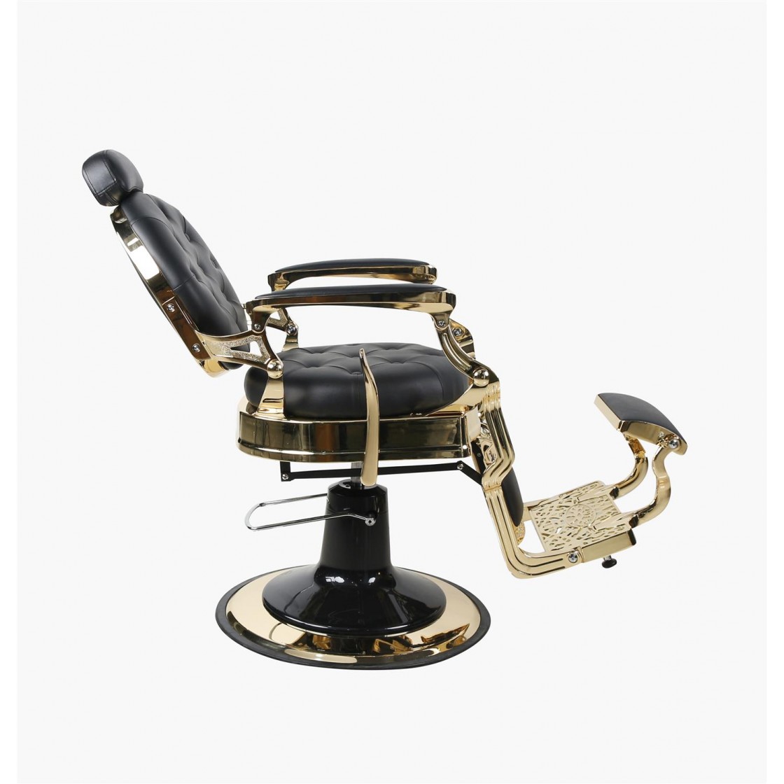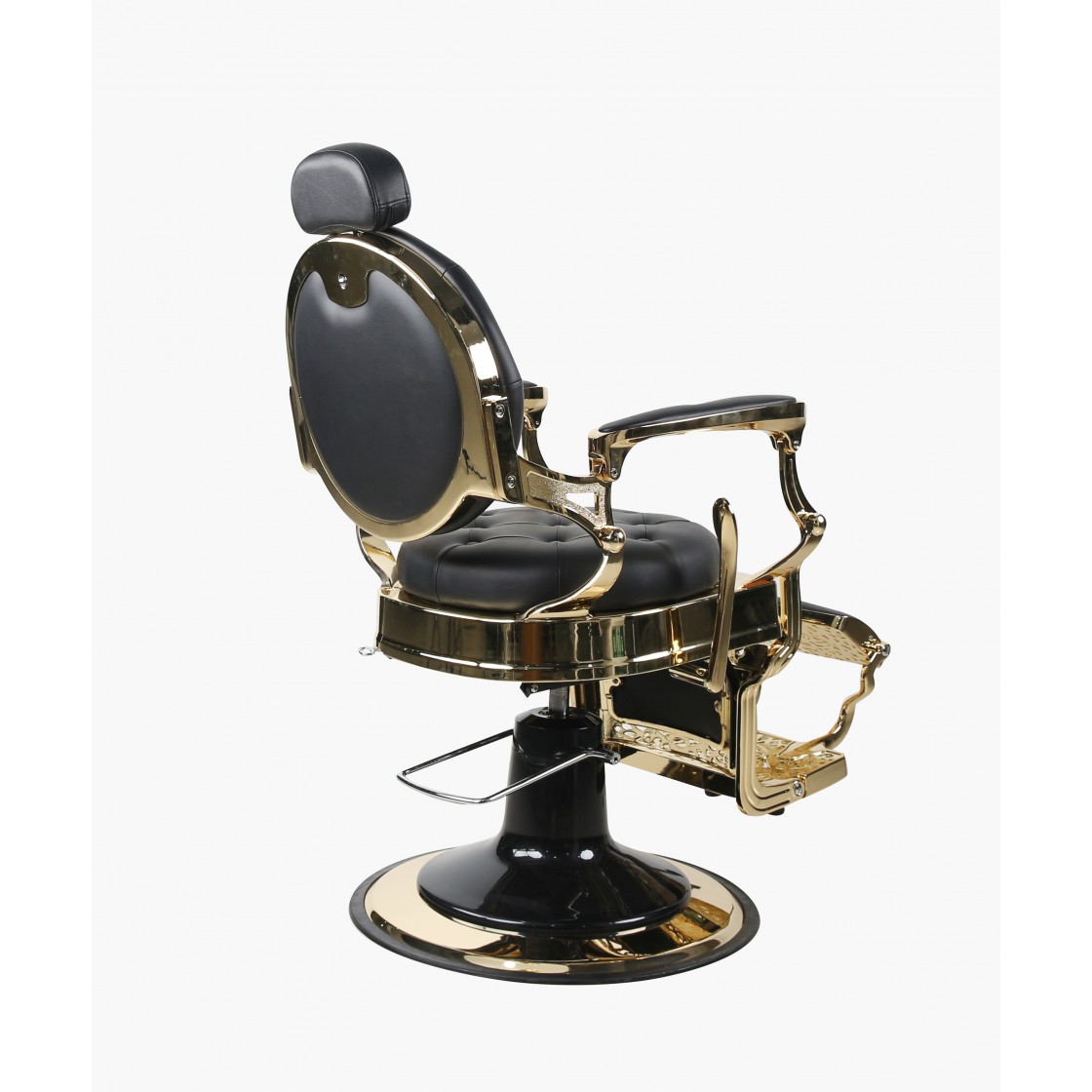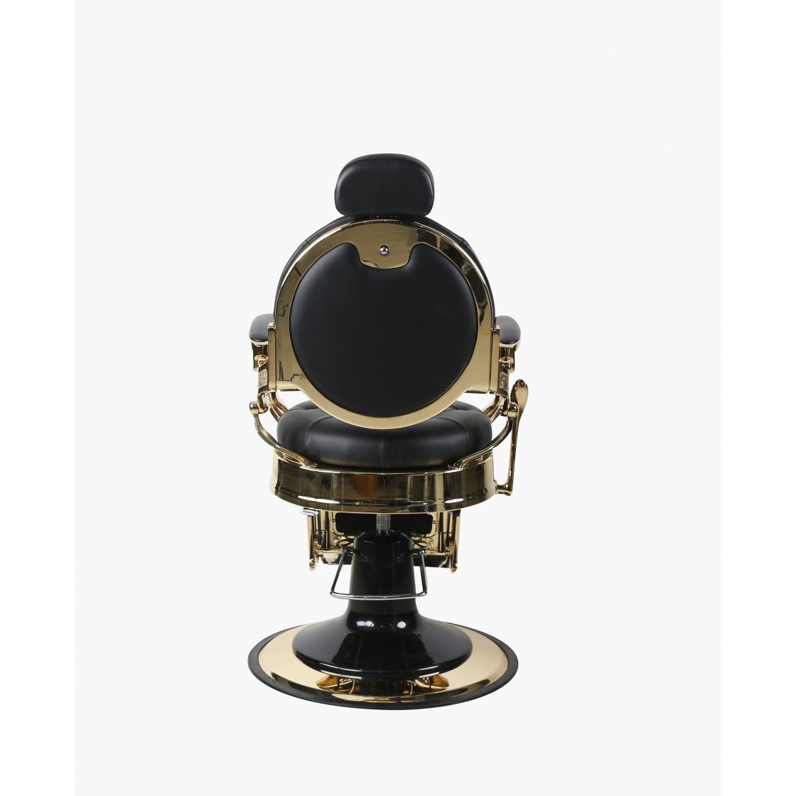Der Barberstuhl The Chester vereint klassische Retro-Ästhetik mit moderner Technik. Goldfarbener Premium-Rahmen trifft auf schwarzes, pflegeleichtes Kunstleder – ein Statement-Piece für anspruchsvolle Barber Shops und Friseursalons.